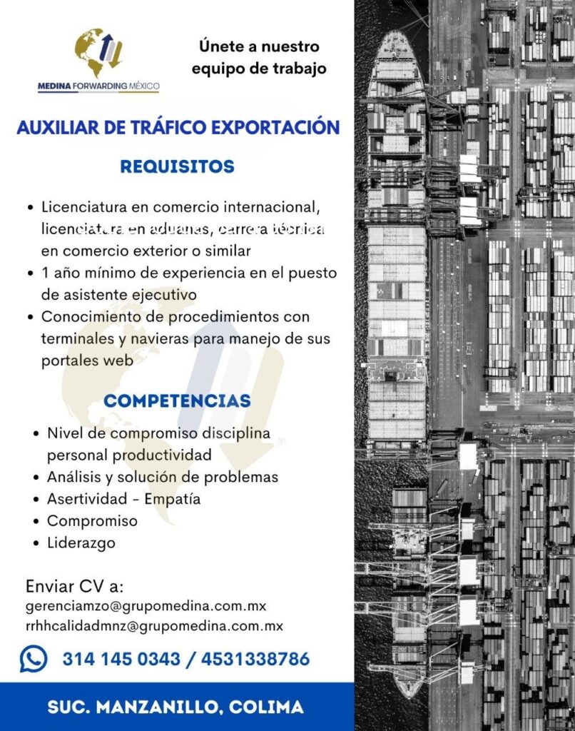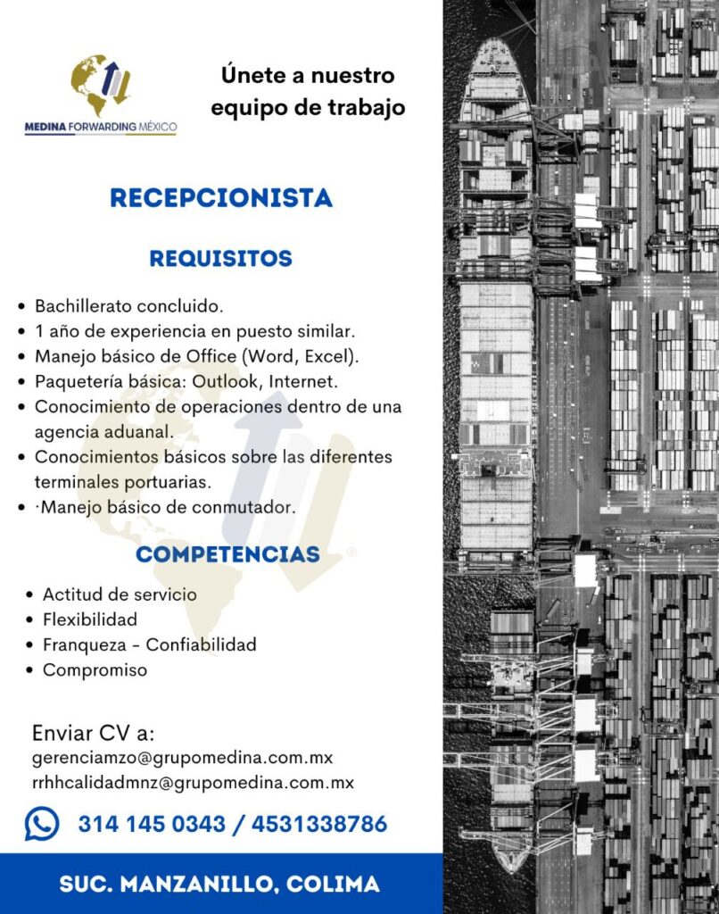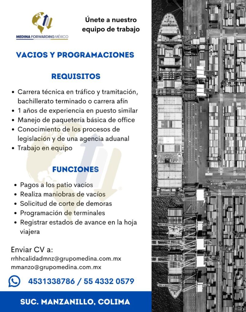 Vacantes En esta sección podrás encontrar todas las ofertas de empleo que tenemos en MEDINA FORWARDING MÉXICO. ¡Es momento que te unas a nuestro gran equipo de trabajo! Please enable JavaScript in your browser to complete this form.Full Name *NameSurnamesLayoutEmail *PhoneLayoutPuesto o Vacante Solciitado *Rango de Salario Esperado *Fecha de Posible Inicio *Carga tu CV * Click or drag a file to this area to upload. Carga tu Currículum Vitae en los formatos requeridos sin exceder el máximo de 3MB.Comentarios AdicionalesEnviar Llena el formulario o envia tu CV directamente a:acarballo@grupomedina.com.mxgdominguez@grupomedina.com.mxO a los teléfonos con WhatsApp(229)958-6510 | (229)264-4512